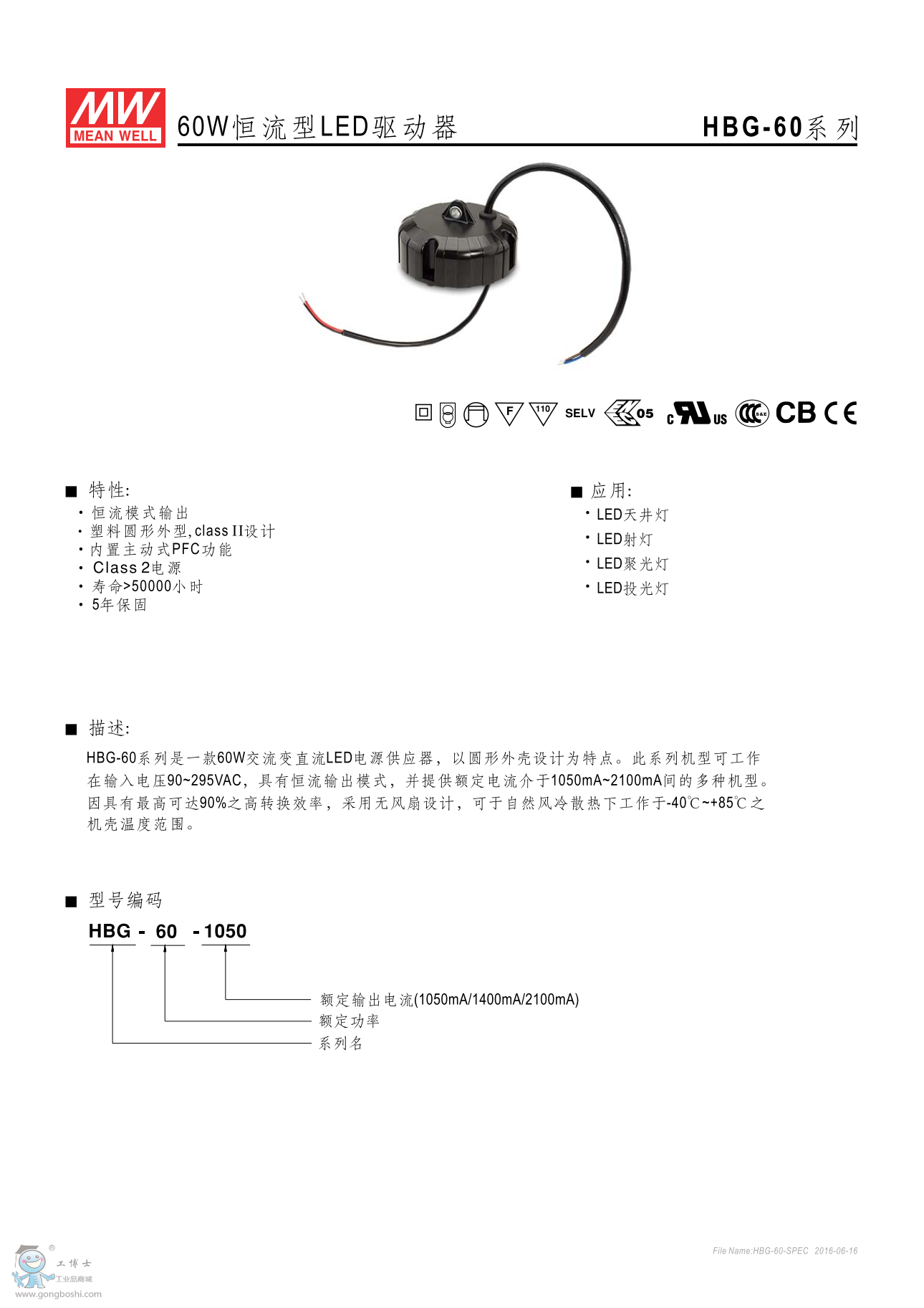 明緯HBG-60-1400 60.2W1400mA 恒流型LED驅(qū)動(dòng)器 |
