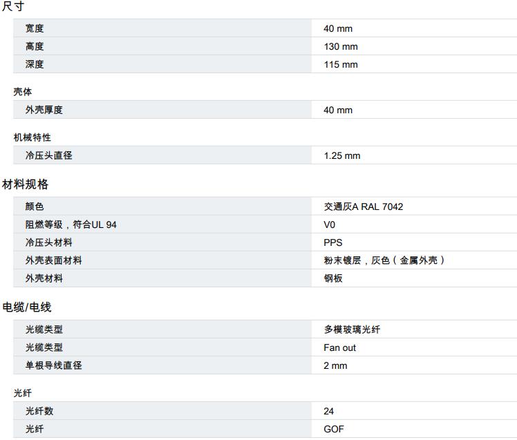 分配器,設(shè)計(jì):DIN導(dǎo)軌模塊,保護(hù)類型:IP20,位數(shù):24,材料:鋼板,連接方法:Q-ODC連 接器,電纜出線:下行,顏色:交通灰A RAL 7042,以太網(wǎng)