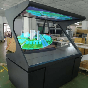 柜體時尚美觀,有科技感;頂部四面透明,空間成像;色彩鮮艷,對比度,清晰度高;有空間感,感,形成空中幻象;中間可結(jié)合實物,實現(xiàn)影像與實物的結(jié)合;也可配加觸摸屏實現(xiàn)與觀眾的互動